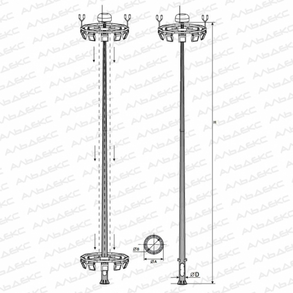 Высокомачтовые опоры освещения, предназначенные для монтажа большого количества светильников (до 12) на высоте, позволяющей увеличить их продуктивность и площадь охвата. Опоры ВМО-35-В исп. 2 заменяют собой сразу несколько стандартных опор освещения, что позволяет полностью окупить их увеличенную стоимость, связанную не только с большой металлоемкостью, но и со сложной организацией конструкций. При этом такие металлоконструкции отличаются оптимальным для своих габаритов весом, не создают излишней нагрузки на грунт, могут быть использованы для подземного подвода кабельной системы, что позволяет отказаться от протягивания дополнительных проводов. Системы используются на стадионах, на промышленных площадках и т.д. Их гармоничный дизайн и современное исполнение, а также возможность обслуживания без привлечения габаритной спецтехники, которой часто требуется специальный подъезд, позволяют использовать их при обустройстве жилых комплексов.
