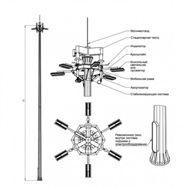 Высота высокомачтовых опор МГФ 35 метров. Их грузоподъёмность составляет до 800 кг. Количество прожекторов в каждой опоре — до 12 штук.
